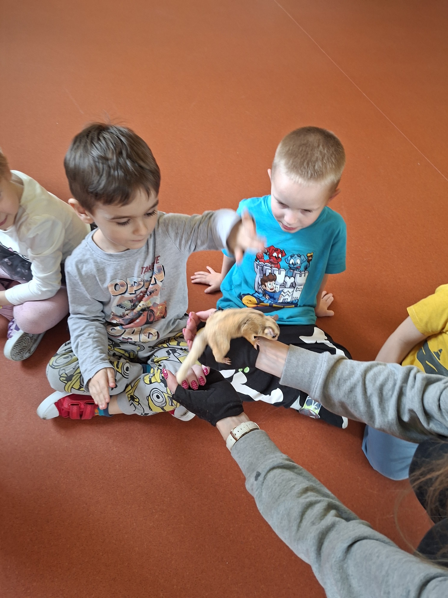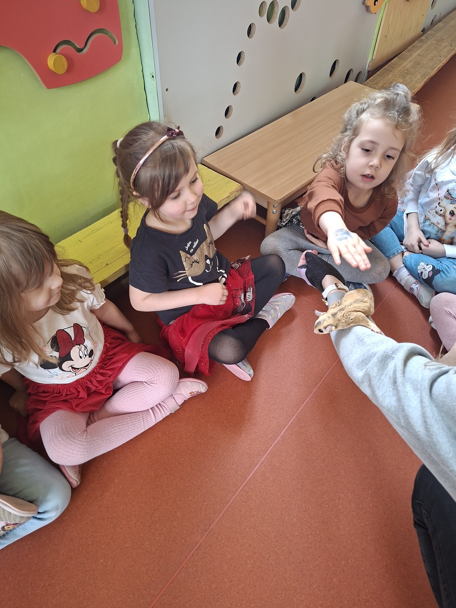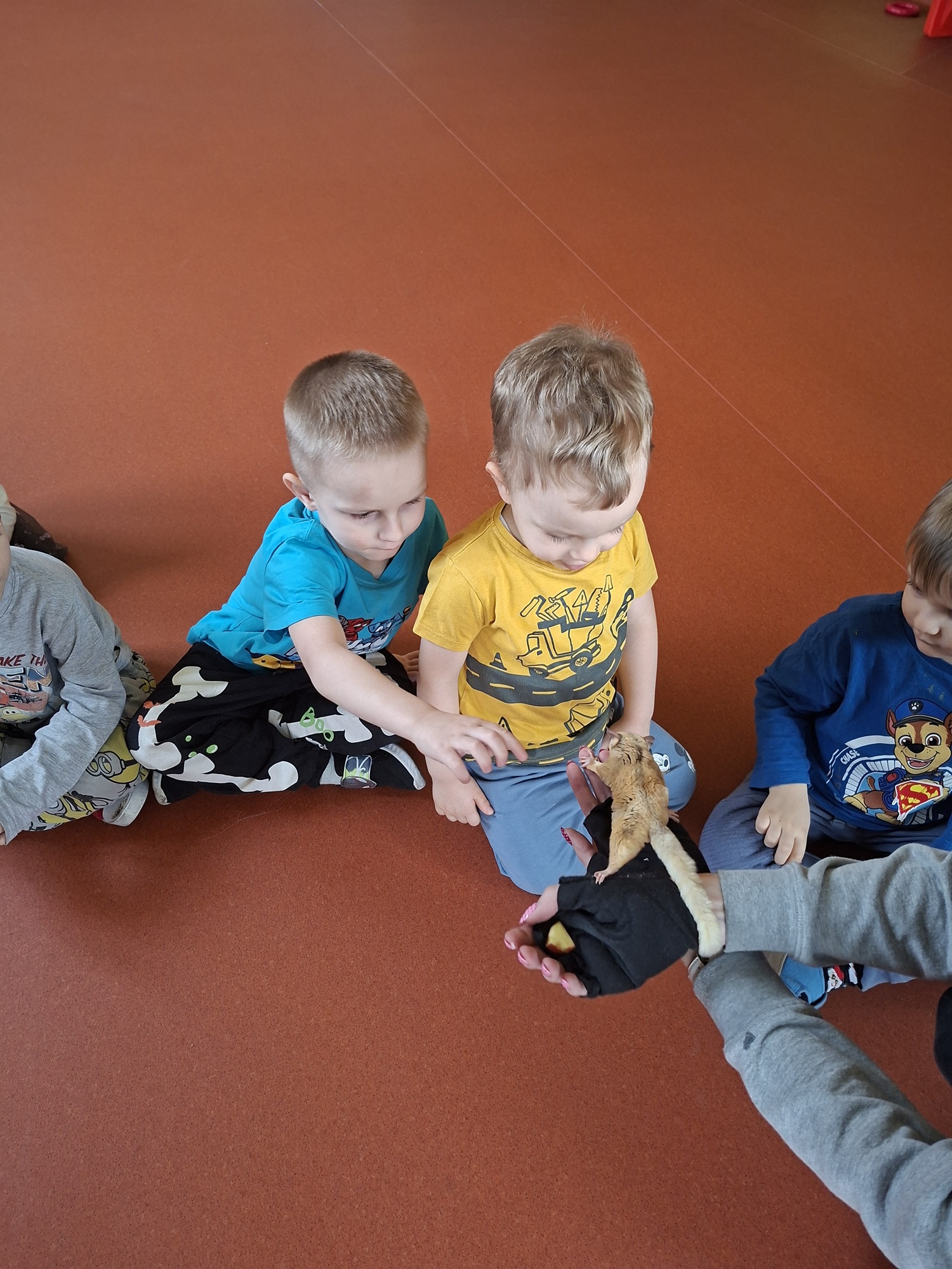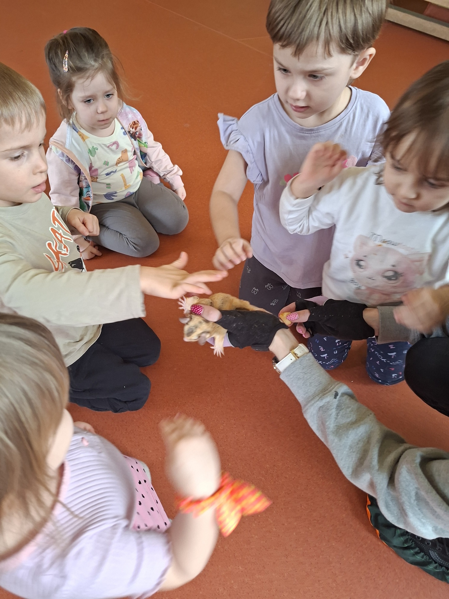 Dziś w naszym przedszkolu odbył się pokaz zwierząt. Odwiedzili nas: lotopałanka (latająca wiewiórka) Rysio i jeż pigmejski Igusia. Dzieci dowiedziały się wielu ciekawych rzeczy na temat zwierzątek, oczywiście mogły je też pogłaskać.