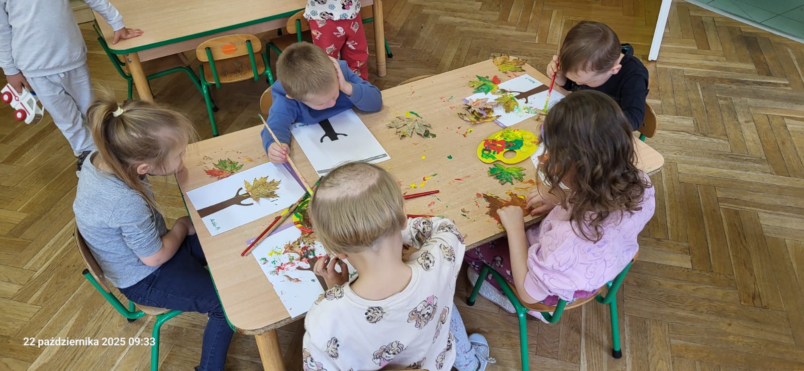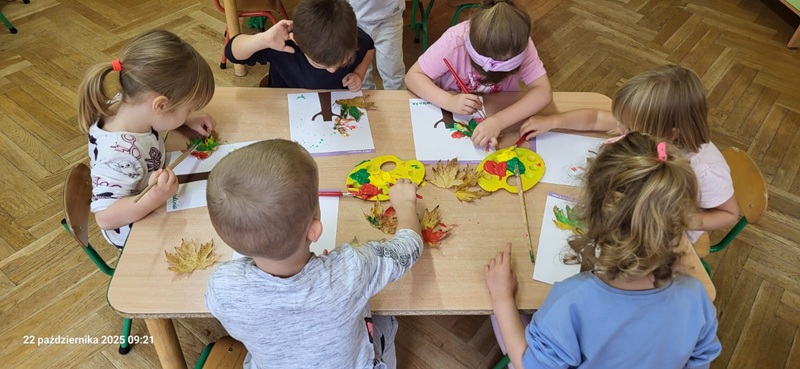 Dziś Motylki tworzyły za pomocą skarbów jesieni - dzieci stemplowały liśćmi pomalowanymi farbami.