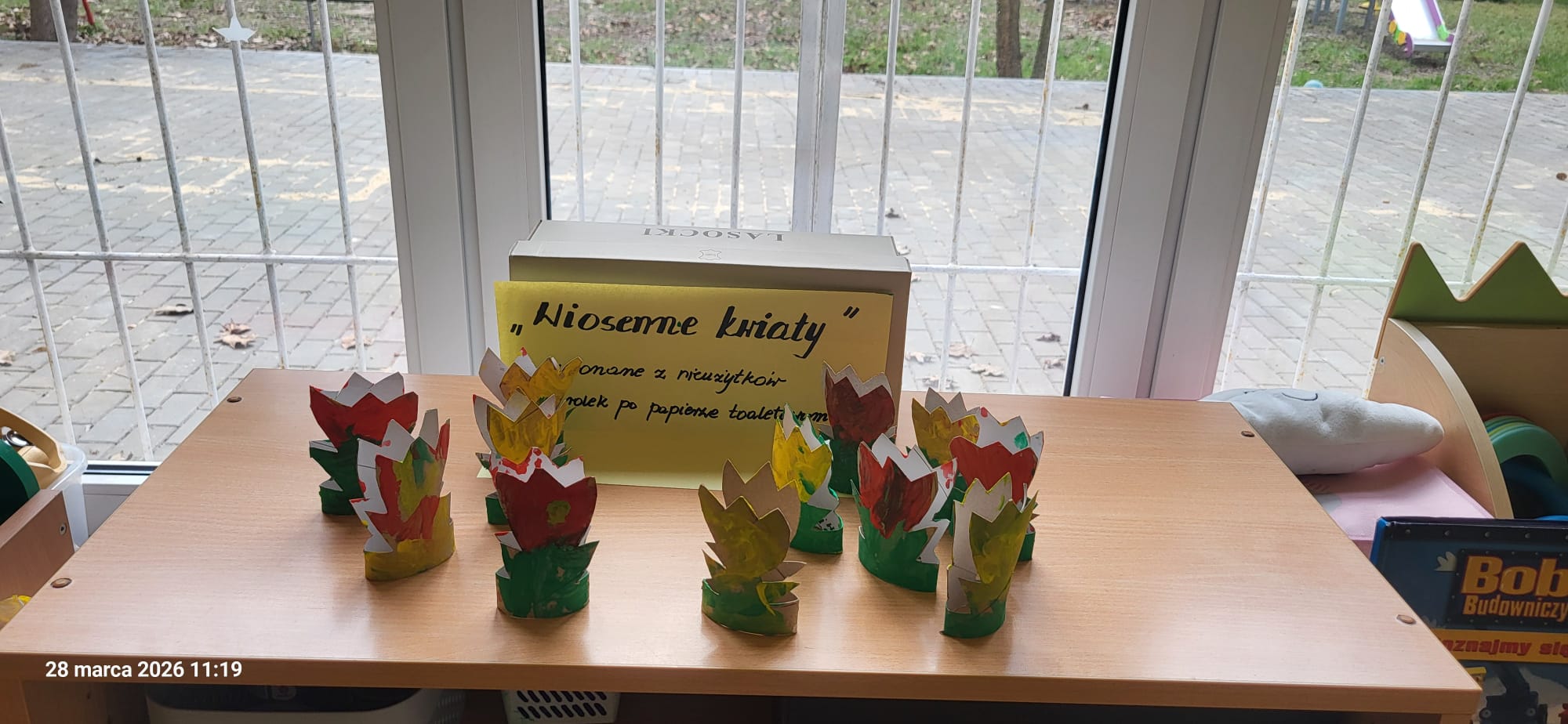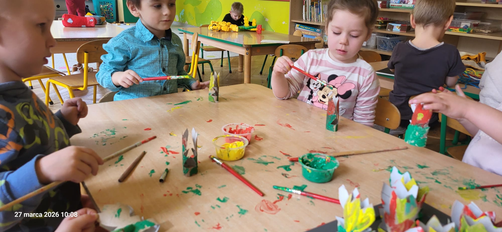 Dzieci wykonują wiosenne kwiatki z nieużytków (rolek po papierze toaletowym) realizując program "Kubusiowi Przyjaciele Natury"