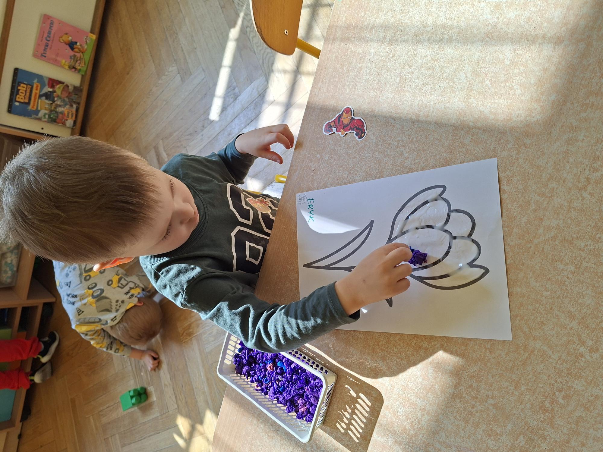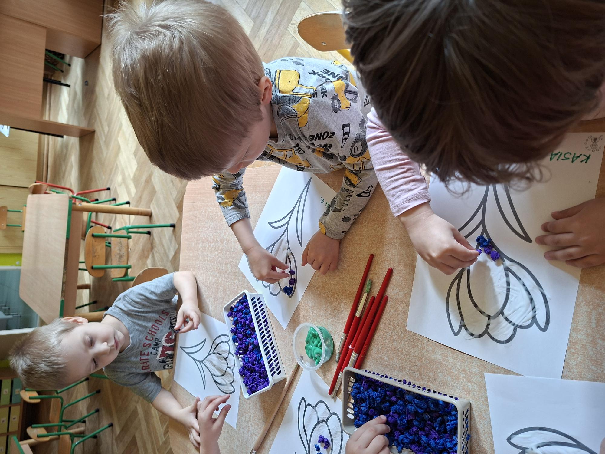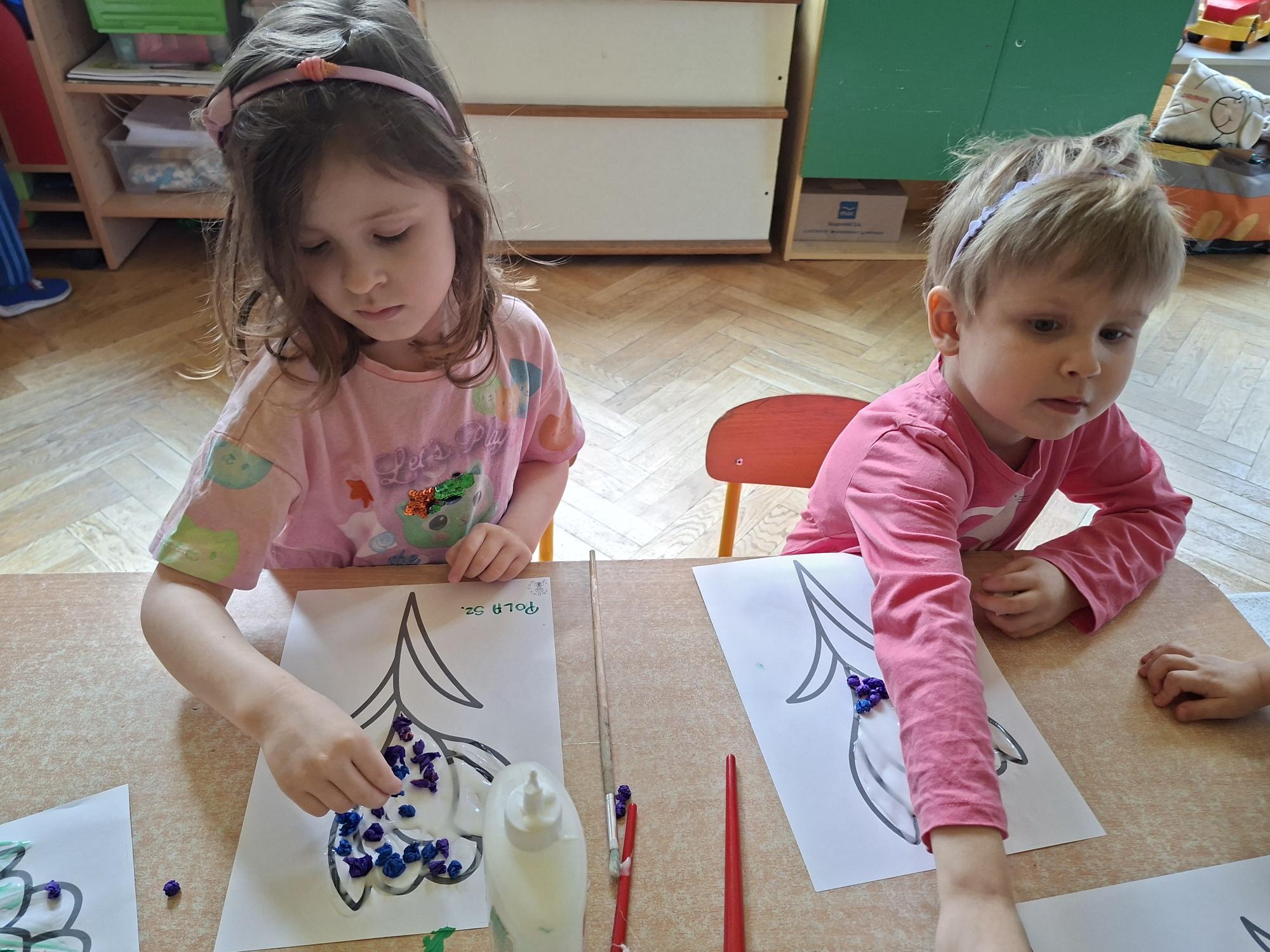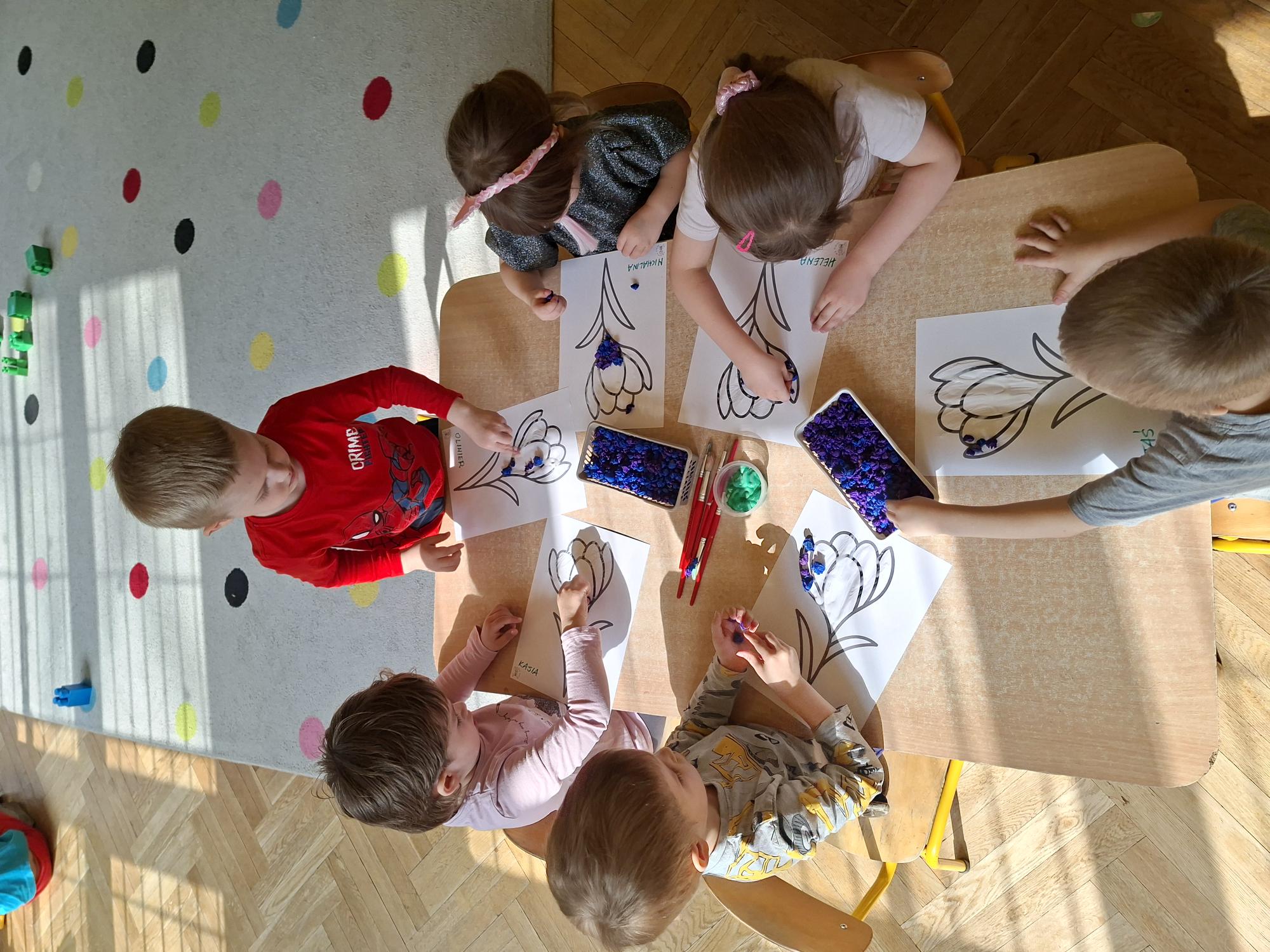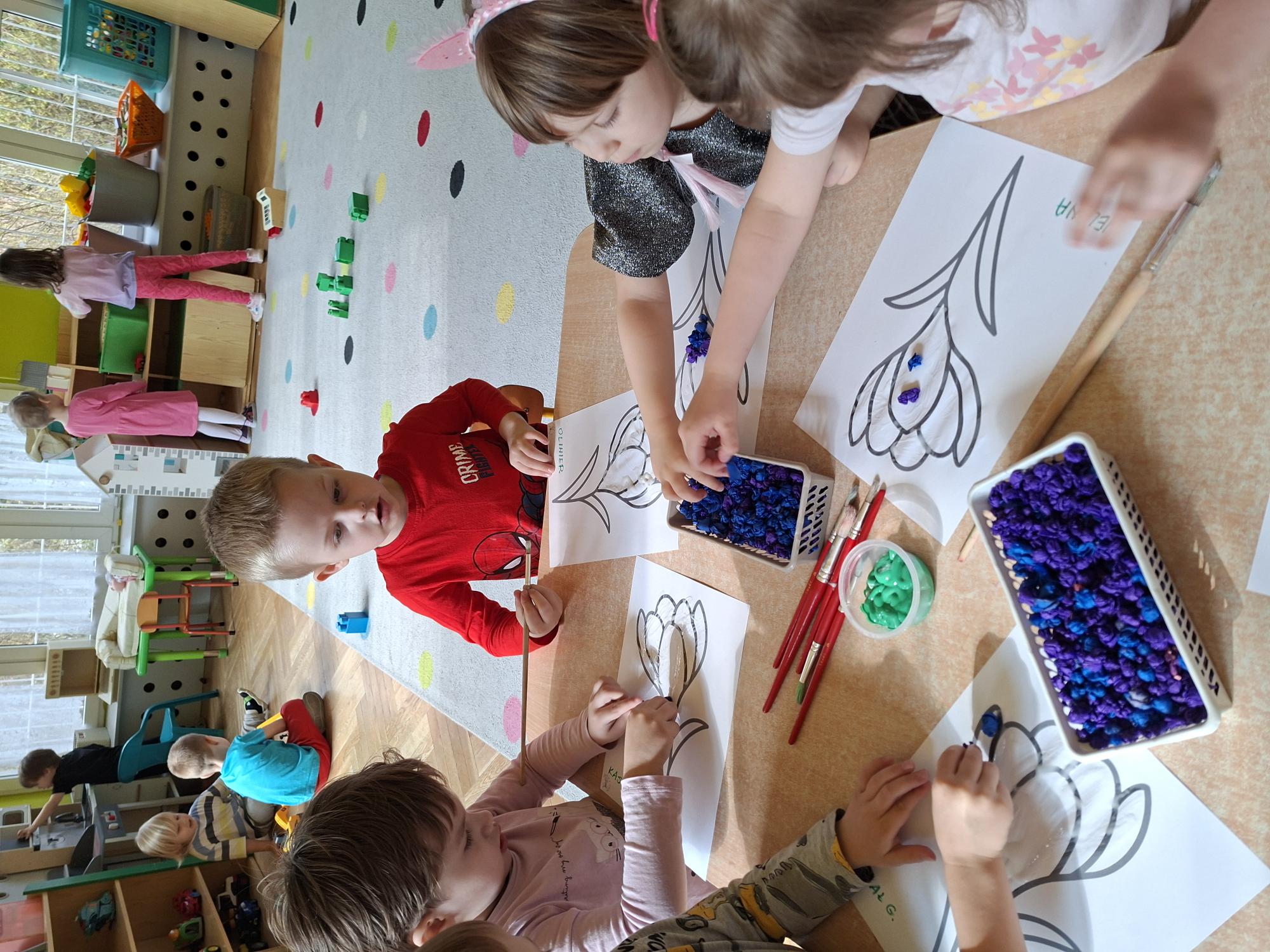 Przedszkolaki wyklejały dziś sylwetę krokusa kuleczkami z bibuły. Doskonale poradziły sobie z tym zadaniem.